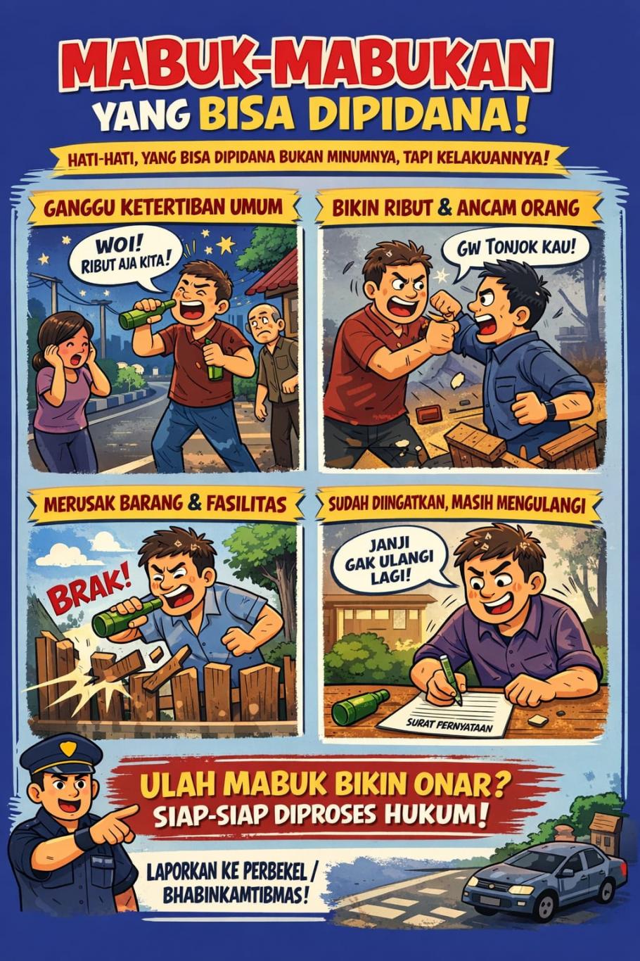 Dalam KUHP terbaru (UU No. 1 Tahun 2023), mabuk-mabukan tidak otomatis dipidana. Hukum tidak melarang seseorang hanya karena mengonsumsi minuman beralkohol. Namun, perilaku mabuk dapat dipidana jika menimbulkan gangguan ketertiban umum atau membahayakan orang lain. Artinya, yang dihukum bukan sekadar mabuknya, tetapi dampak dari perilaku saat mabuk tersebut.