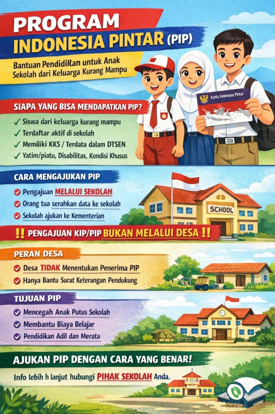 Perlu ditegaskan kepada masyarakat bahwa desa tidak memiliki kewenangan untuk mendaftarkan atau menetapkan penerima KIP/PIP. Peran desa hanya sebatas memberikan keterangan pendukung (seperti surat keterangan tidak mampu) apabila diminta oleh sekolah, bukan sebagai pengusul utama. Oleh karena itu, masyarakat diharapkan tidak salah paham dan tidak mengajukan KIP ke kantor desa.